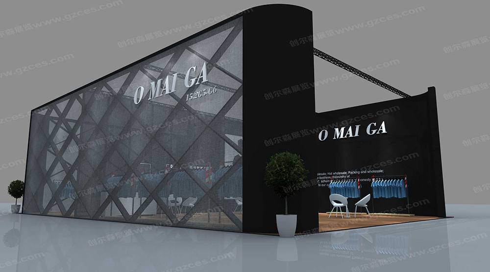 创尔森展览承接噢买嘎在广州服装展搭建服务,整体色调黑灰色为主,突出噢买嘎服饰设计理念,整体的构建显示沉稳简洁大气。